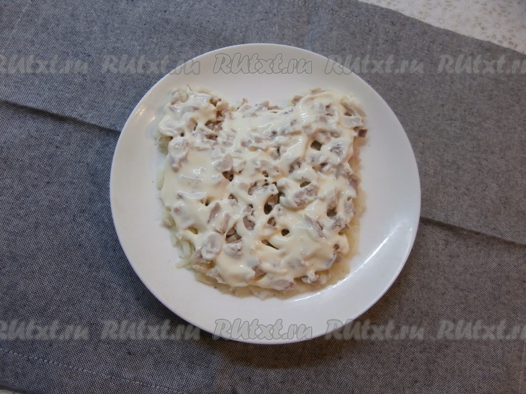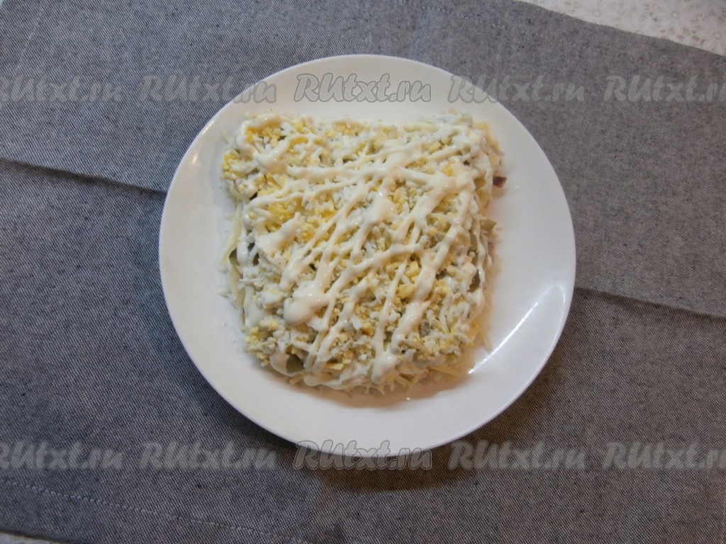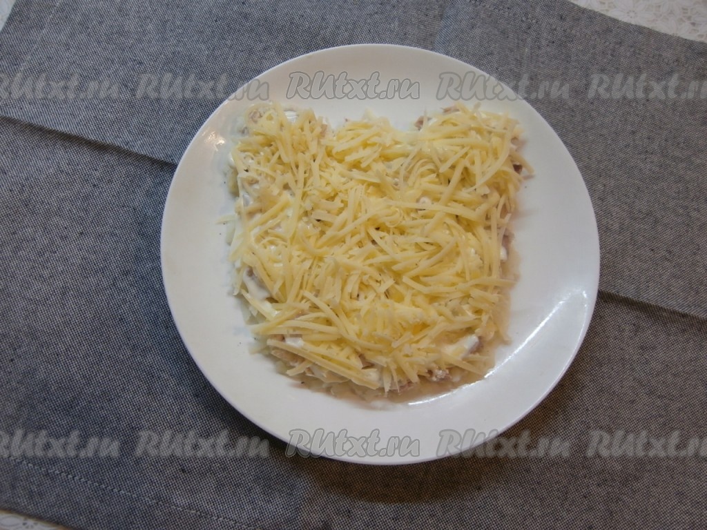 Следующим слоем выложить натёртый на средней тёрке сыр.