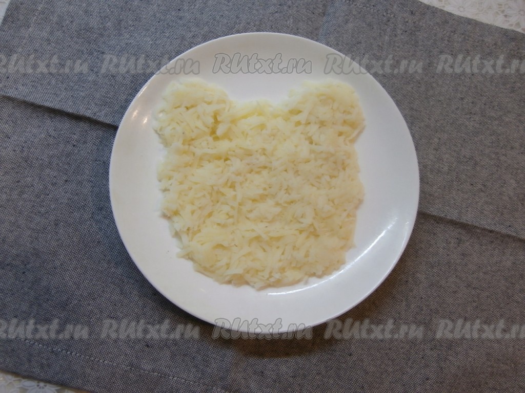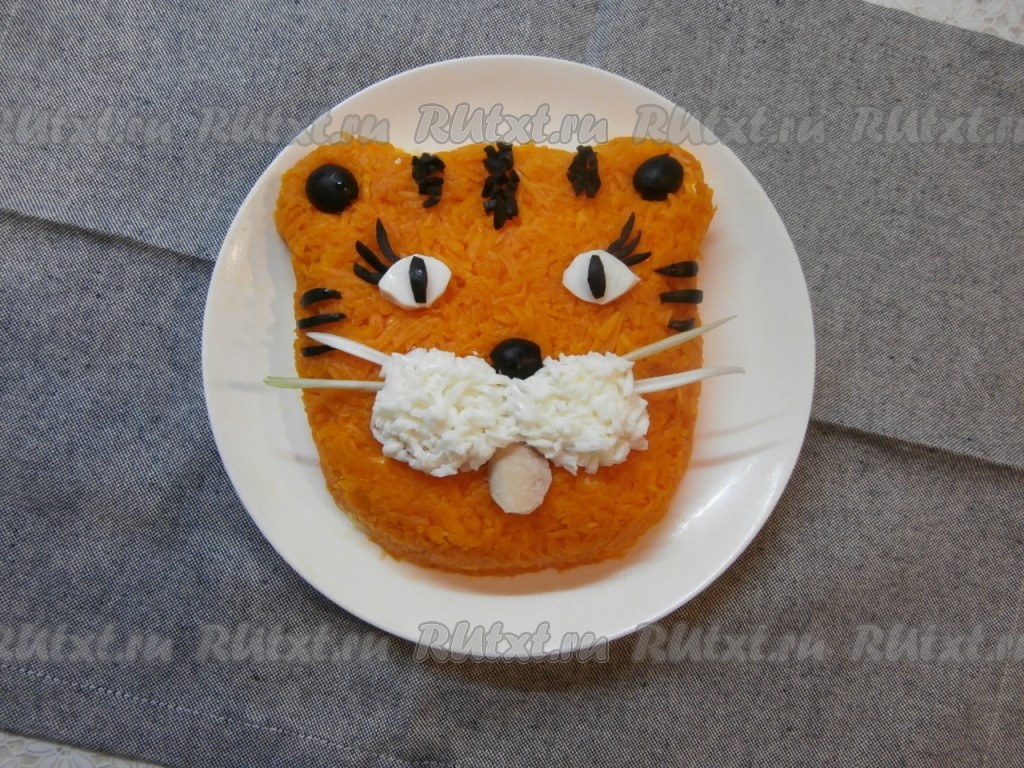 Картофель и крупную морковку, не очищая овощи от кожуры, отварить до готовности (на варку с момента закипания воды потребуется минут 25-30), остудить их и очистить. Сварить до готовности куриное мясо (после закипания воды мясо будет готово через 25-30 минут), дать ему остыть. Сварить вкрутую яйца (они будут готовы минут через 8 после начала кипения воды), остудить их в холодной воде и очистить. Картофель натереть на средней тёрке, выложить на плоское блюдо (или тарелку) первым слоем в виде мордочки тигра с ушками. Посолить картошку.