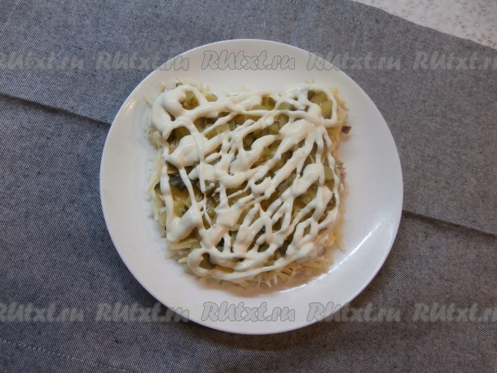 Следующим слоем нужно выложить маринованный огурчик, нарезанный на небольшие кубики, смазать майонезом.