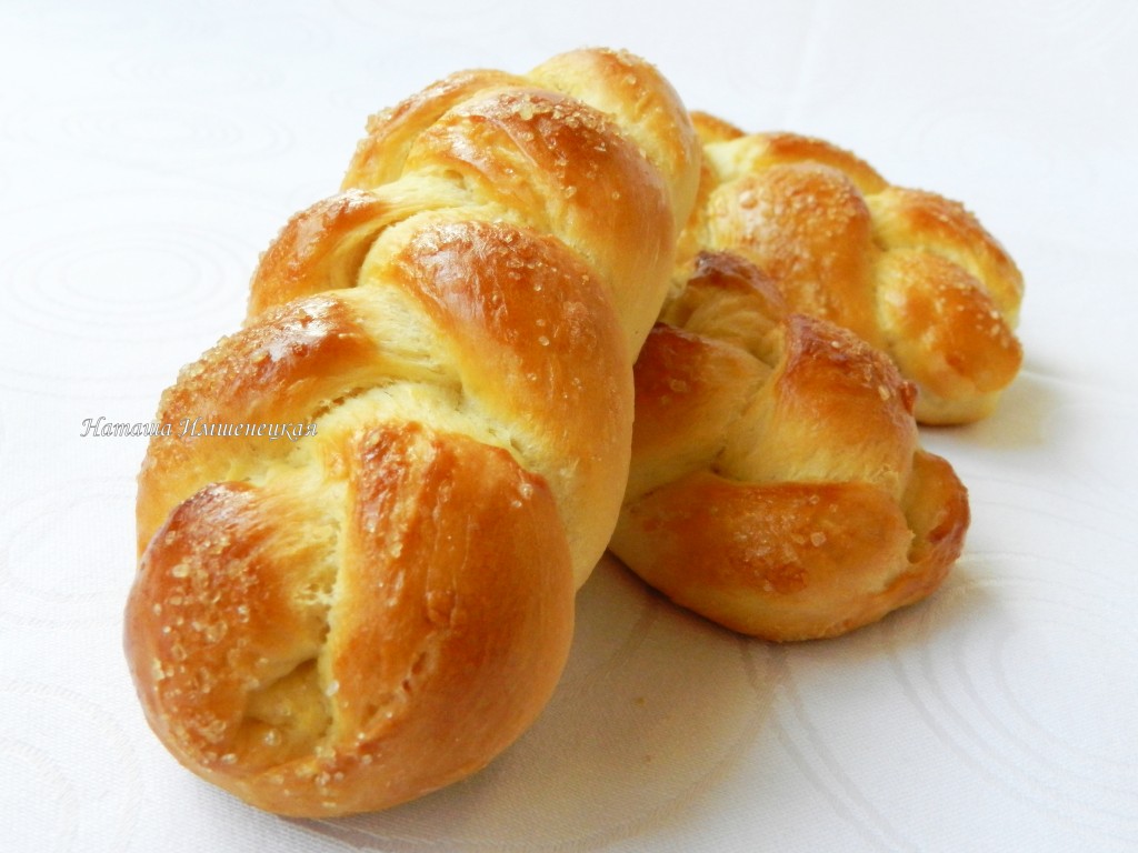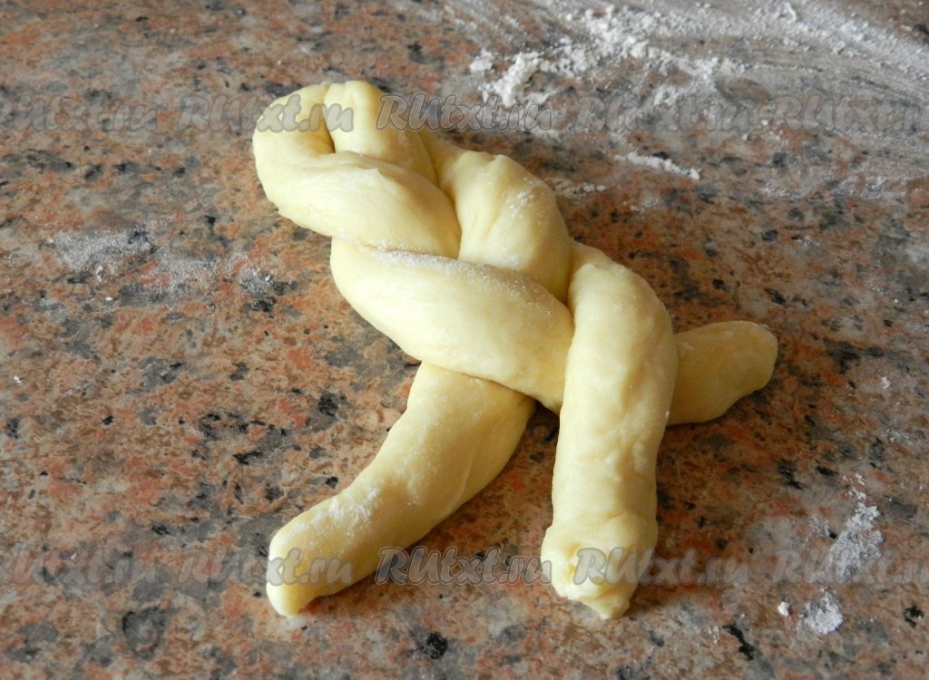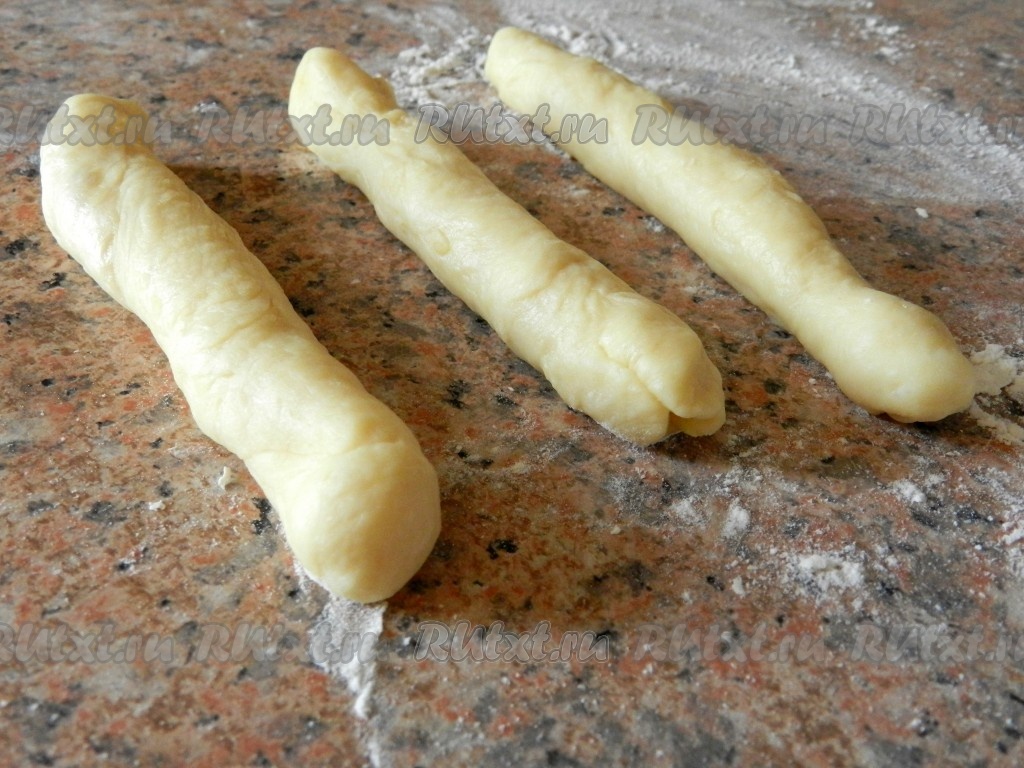 Форму булочкам можно придать любую. Я сегодня решила испечь "косички". Для этого небольшие кусочки теста руками раскатать в жгутики.