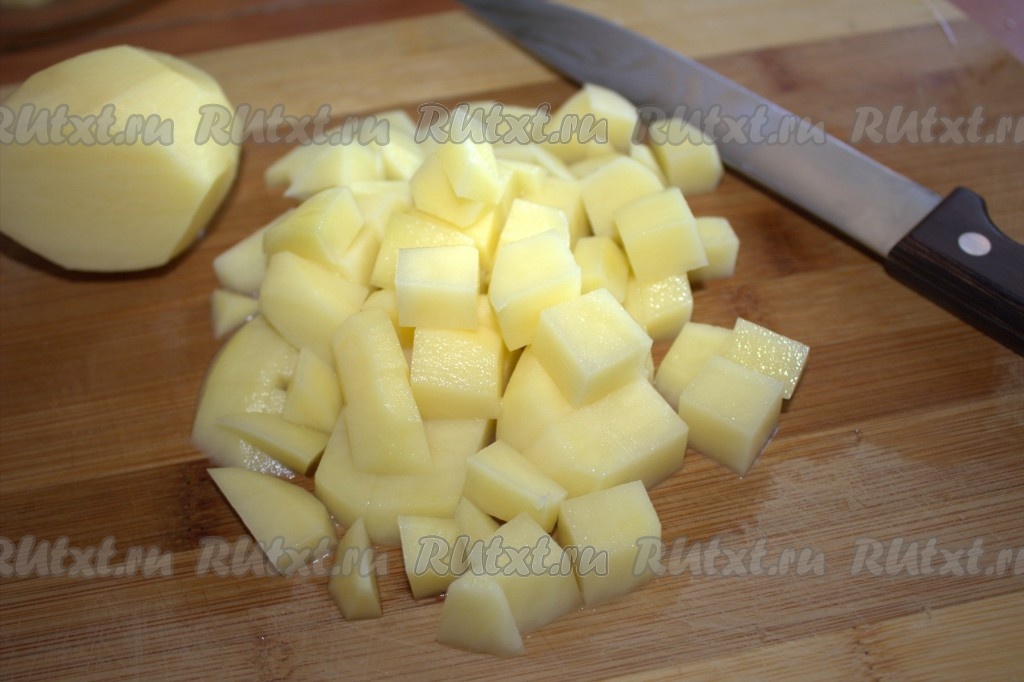 Когда перловка проварится с момента закипания минут 10, выложить в суп очищенную и нарезанную на небольшие кубики картошку.