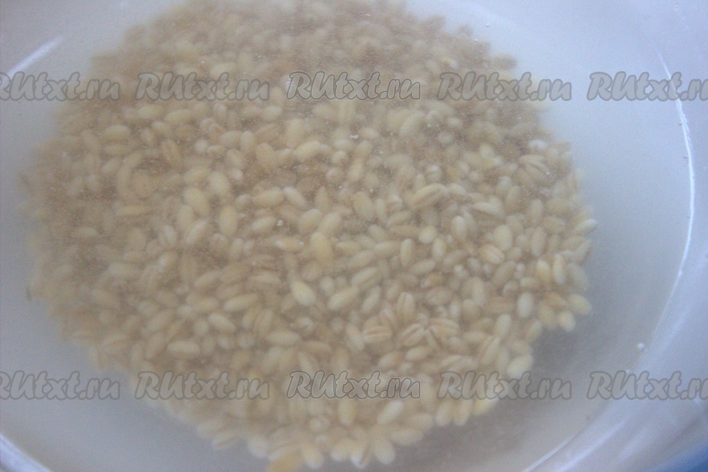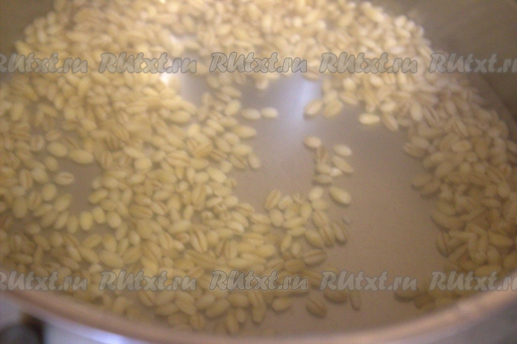 Набухшую перловку хорошо промыть чистой водой. Переложить промытую перловку в кастрюлю, залить 1,5-2 литрами холодной воды. Кастрюлю с перловкой поставить на огонь, а после закипания огонь уменьшить и варить 10 минут.