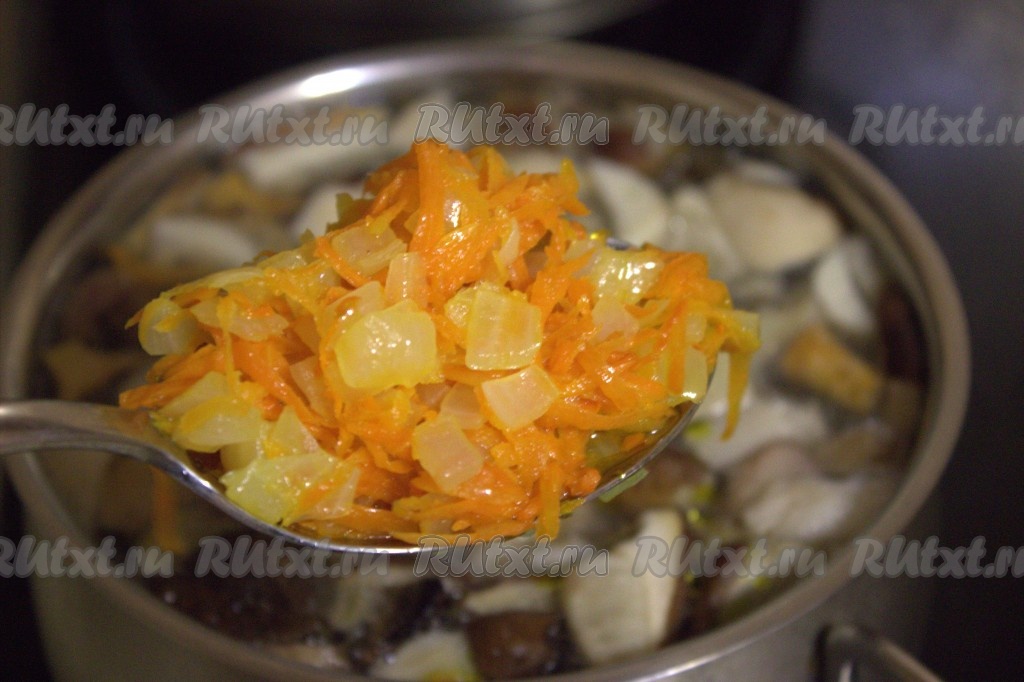 Сразу же в кастрюлю с картошкой и перловкой добавить подготовленные лесные грибы, довести до кипения, а затем, уменьшив огонь, варить, примерно, минут 20-25 (до готовности перловки).