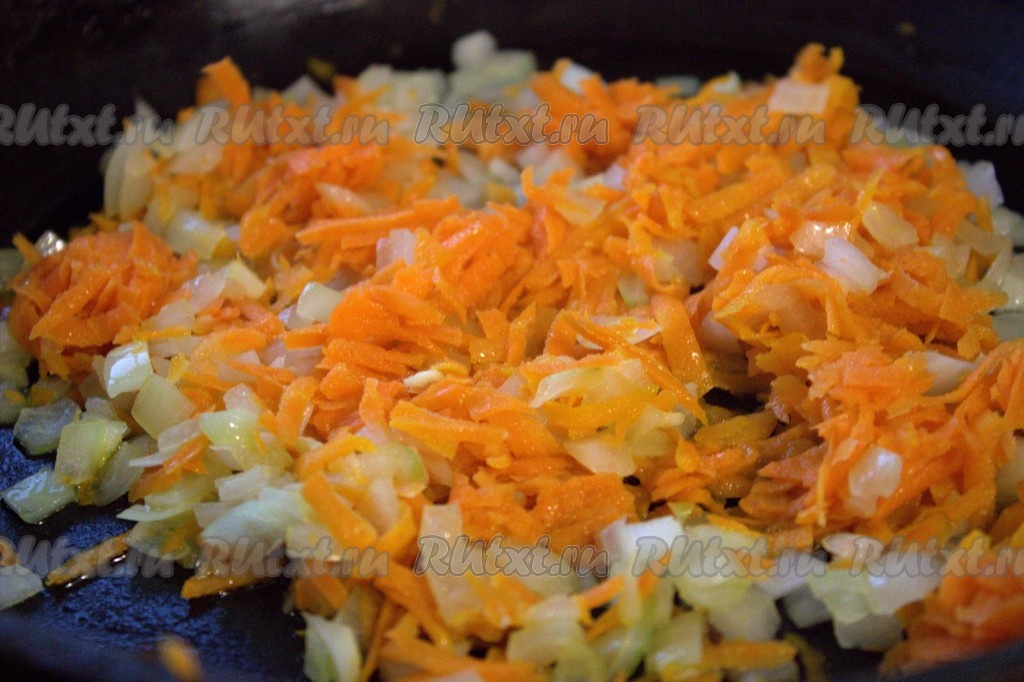 Тем временем очистить луковицу и мелко нарезать. Натереть очищенную морковку на средней тёрке. В сковороде прогреть небольшое количество растительного масла, выложить лук и обжарить его на среднем огне до прозрачности (минуты 3), не забывая периодически перемешивать, затем добавить морковь и, помешивая, обжаривать овощи ещё минут 5.