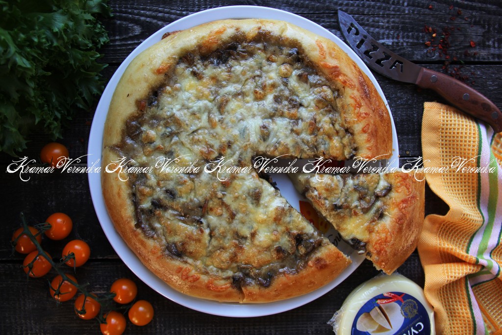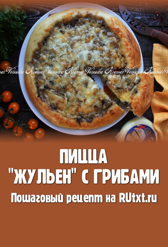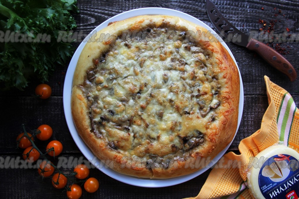 Пышный краешек не даёт вытекать сочной начинке, которая по вкусу напоминает жульен. Сливочно-грибная начинка отлично сочетается с дрожжевым тестом, поэтому пицца, приготовленная по этому рецепту в домашних условиях, получается наивкуснейшей.