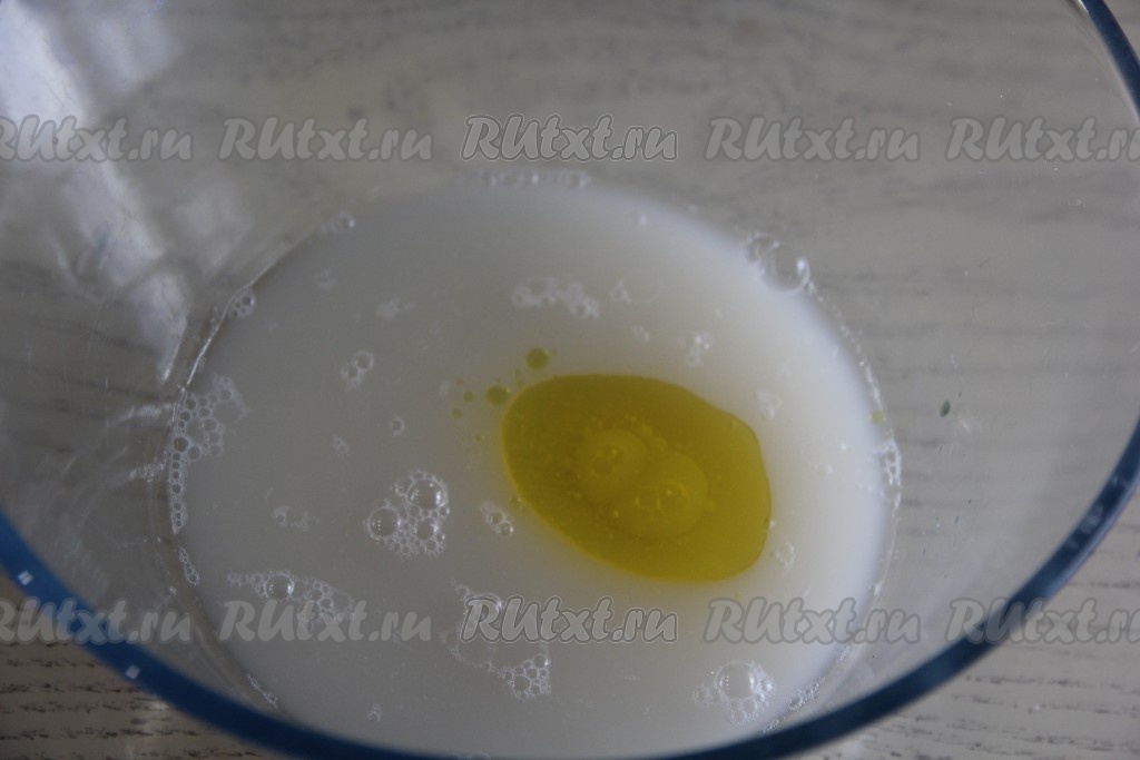 Дрожжи по прошествии 15 минут оживут (запенятся), перелить их в глубокую миску. Туда же влить растительное масло.