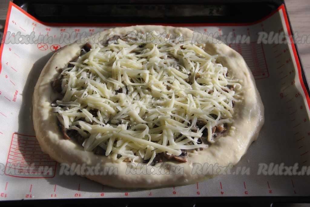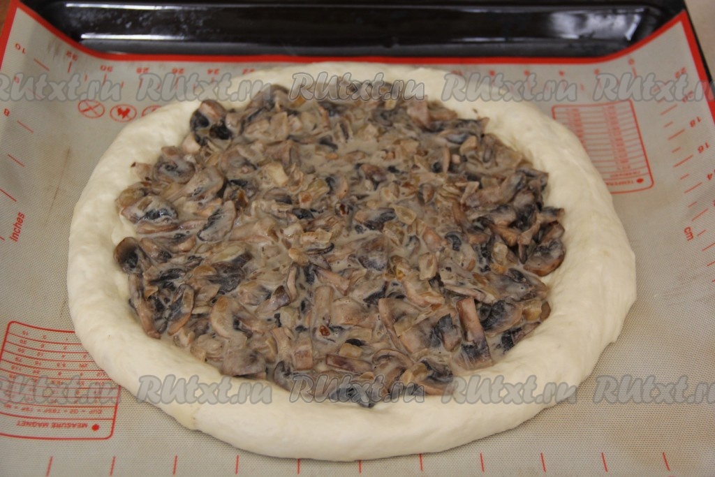 Затем выложить грибную начинку в середину пиццы и равномерно распределить, не заходя на бортики.