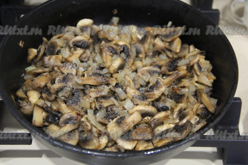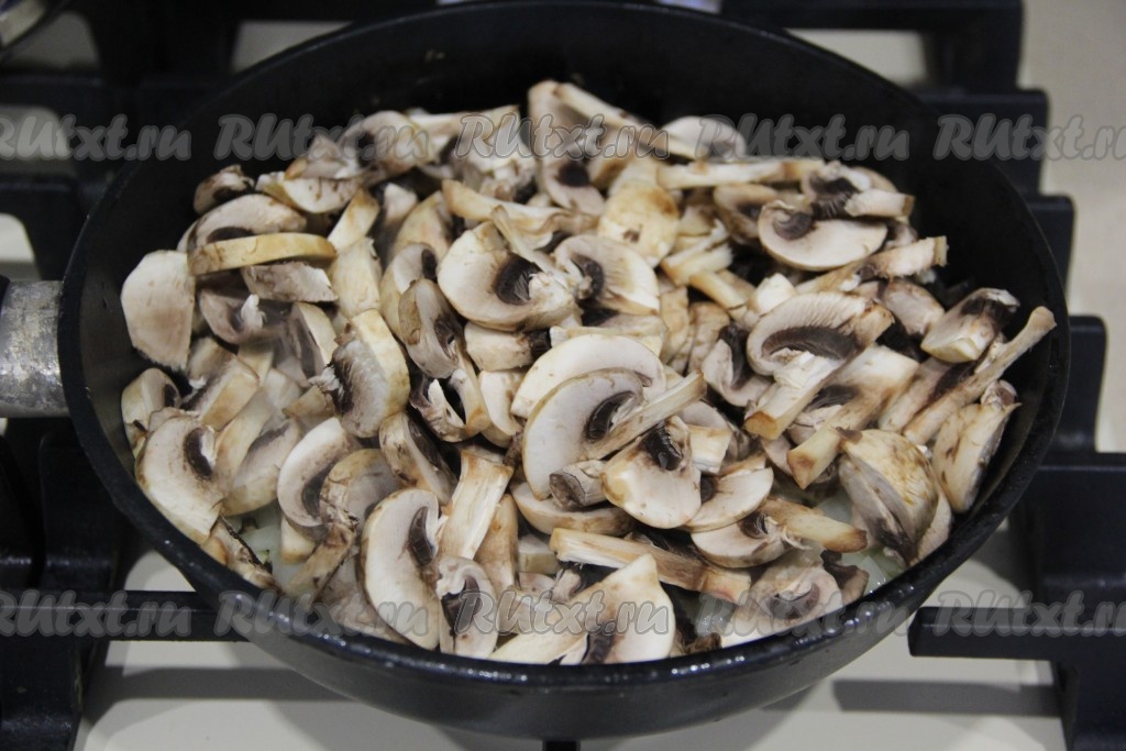 Шампиньоны промыть водой, нарезать на пластинки. Если вы готовите с отваренными лесными грибами, тогда крупные грибочки просто нарежьте на части. Подготовленные грибы выложить к обжаренному луку, перемешать.