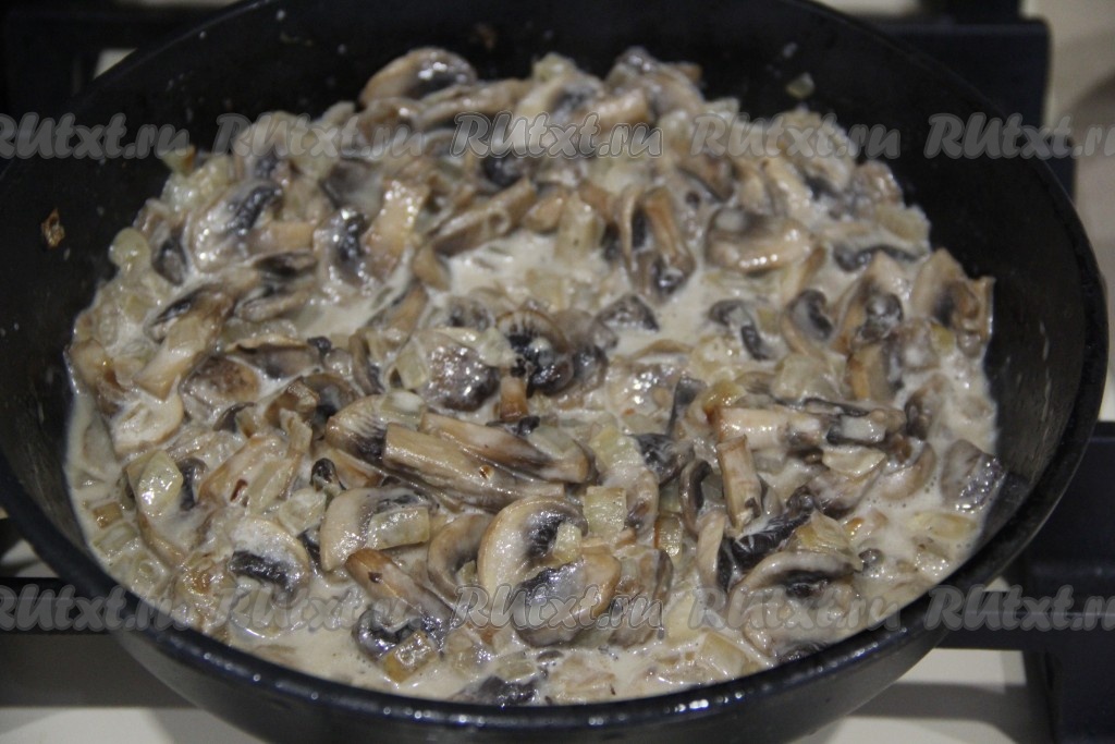 Влить в сковороду сливки, перемешать, потомить грибы в сливках 2-3 минуты, снять с огня, дать остыть и начинка для пиццы "Жульен" готова.