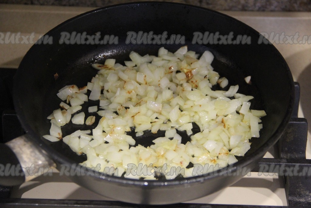 Пока тесто поднимается, займёмся начинкой для пиццы "Жульен", для этого в сковороду нужно влить немного растительного масла, прогреть его и выложить мелко нарезанный очищенный лук. Обжарить лук до золотистого цвета (на это потребуется 3-5 минут) на среднем огне, иногда помешивая.