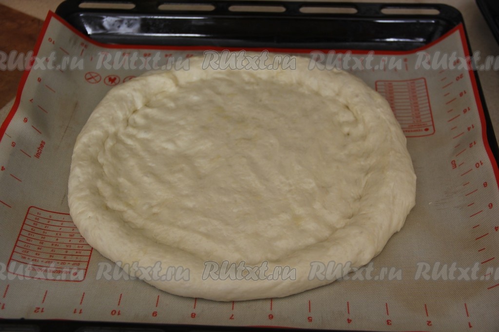 Противень застелить пергаментом (или ковриком для выпечки). Выложить тесто на противень и руками, смазанными растительным маслом, сформировать круглую пиццу диаметром 28 сантиметров с пышным краем. Противень с основой пиццы поставить на 20 минут в тёплое место.