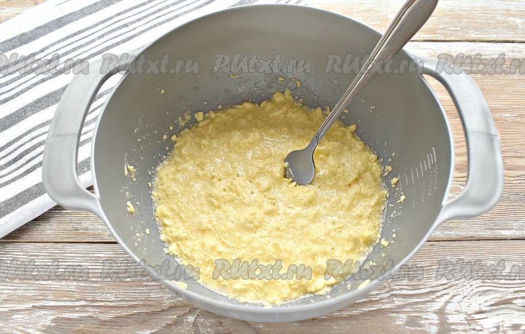 Вилкой перемешиваем содержимое миски в течение 1-2 минут (до однородности).