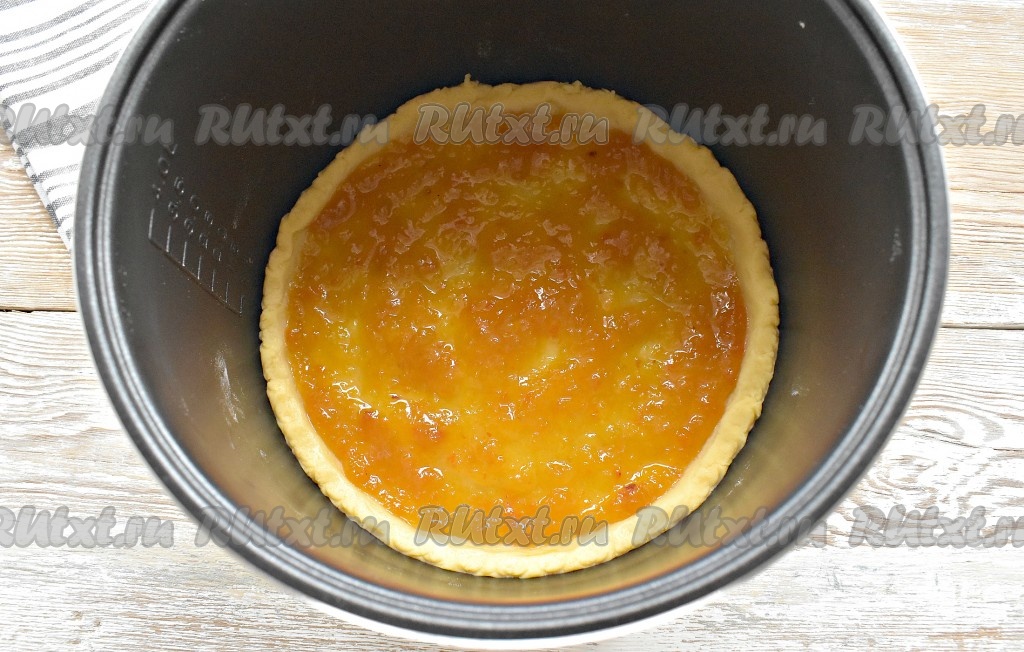 Большую часть теста раскатываем в круглый пласт по размеру дна чаши мультиварки. Я для удобства, чтобы не ошибиться с размером, использовала в качестве «трафарета» поддон для приготовления на пару (он идёт в комплекте с мультиваркой). Пласт выкладываем в чашу, смазывать её необязательно. Делаем невысокие бортики (высотой, примерно, 1,5-2 см).