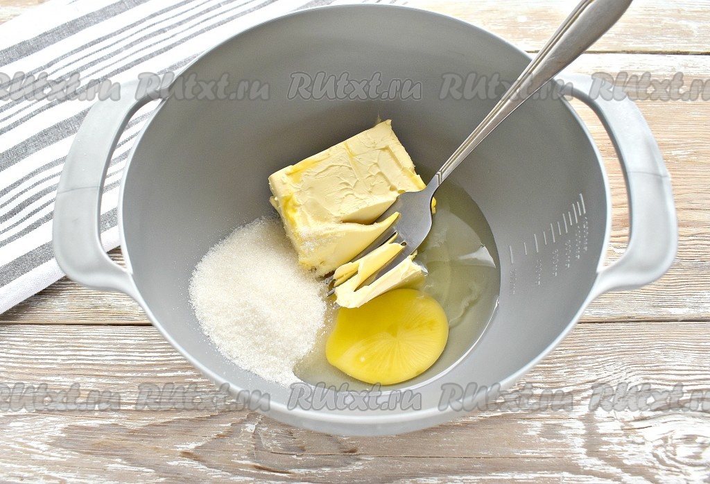 Сливочное масло заранее достать из холодильника, чтобы оно согрелось до комнатной температуры и размягчилось. Выкладываем размягчившееся сливочное масло в миску, вбиваем к нему яйцо, всыпаем сахар.