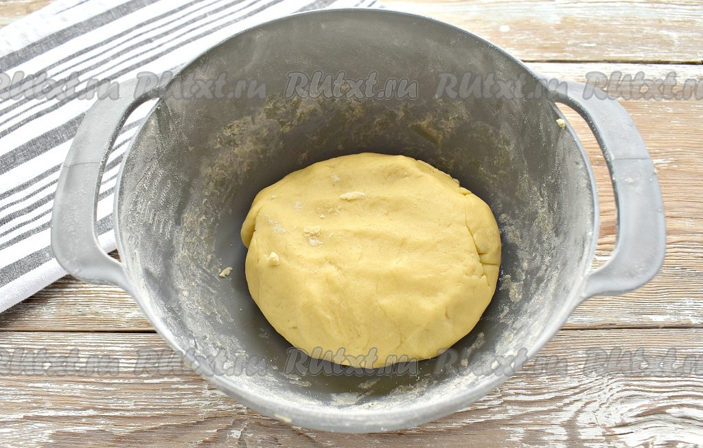 Сначала перемешиваем тесто вилкой, а затем, когда соберётся в комок, замешиваем его на столе. Тесто получается мягким, не прилипает к ладоням. У меня песочное тесто получилось массой около 450 грамм. Тесто нужно разделить на 2 части. Я поделила его на 2 куска: один массой 300 грамм (для основы) и второй массой 150 грамм (для верха).
