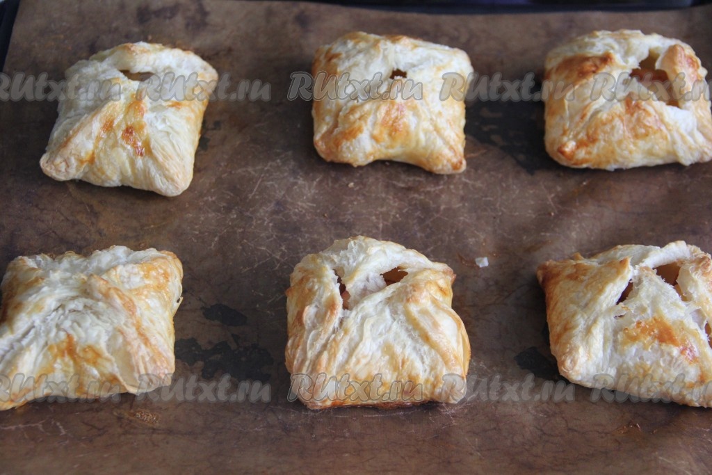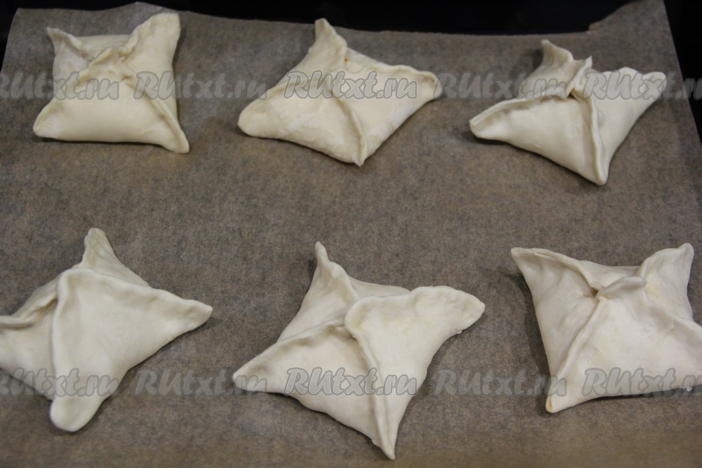 Выложить 8 сформированных конвертиков с яблоками на противень, застеленный пергаментом.