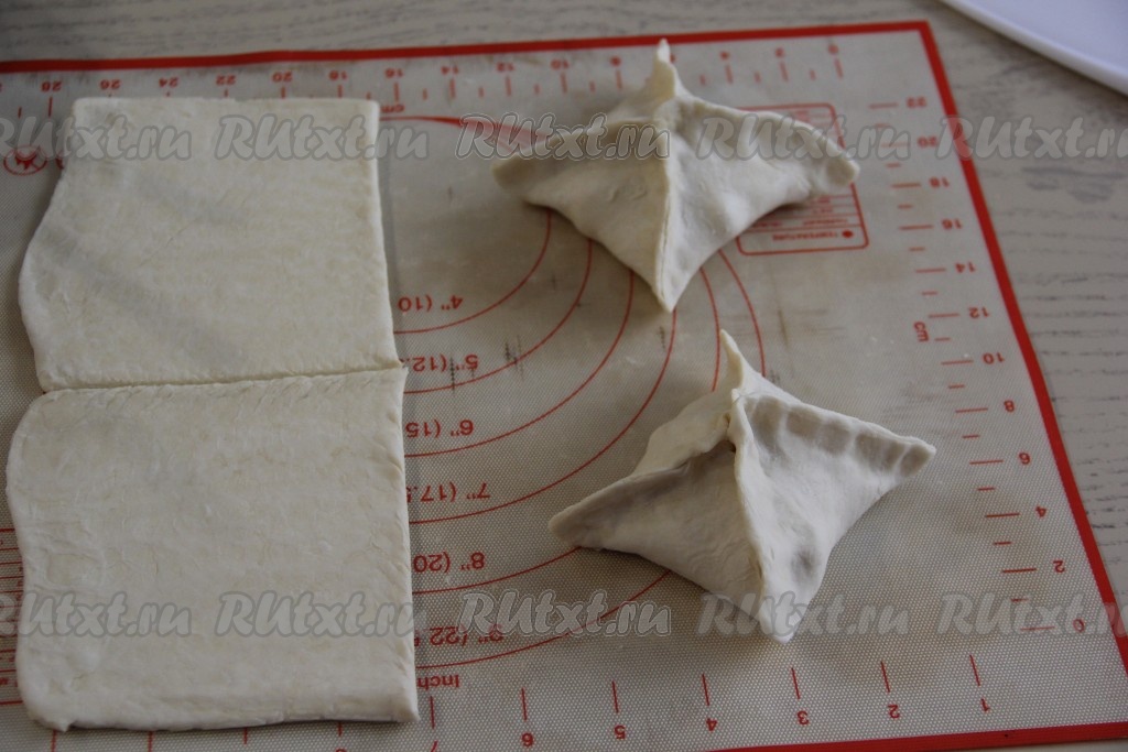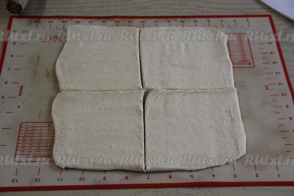 После того как начинка остынет и тесто разморозится, можно приступать к формированию конвертиков. Вначале слегка раскатать на силиконовом коврике (или на другой поверхности, припылённой мукой) первый пласт теста и разрезать его на 4 квадрата. Аналогично раскатать и нарезать второй пласт теста. Получатся 8 квадратов слоёного теста.