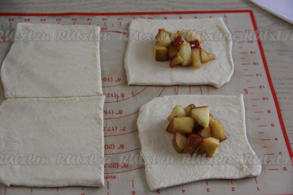 По 1 столовой ложке яблочной начинки выложить на середину каждого квадрата.