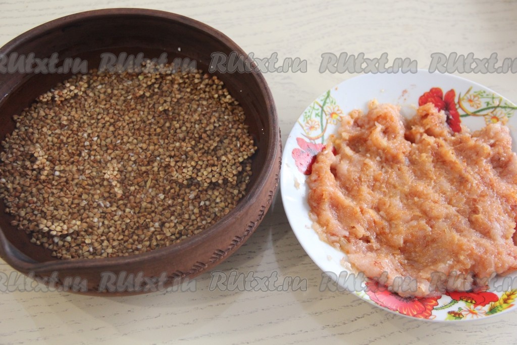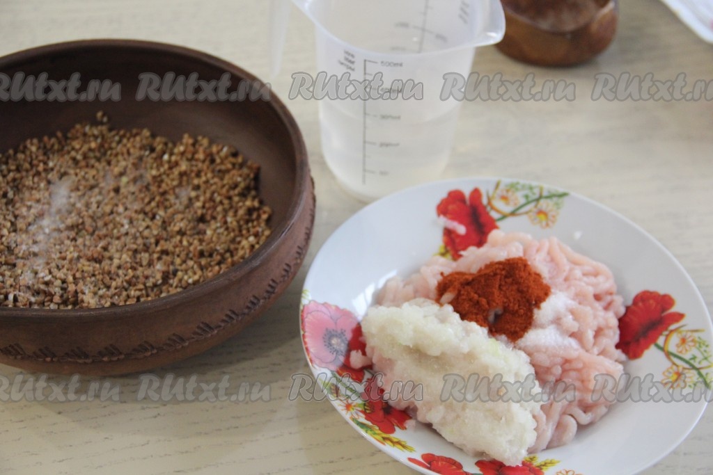 Тщательно вымесить фарш. В форму с гречкой влить воду комнатной температуры.