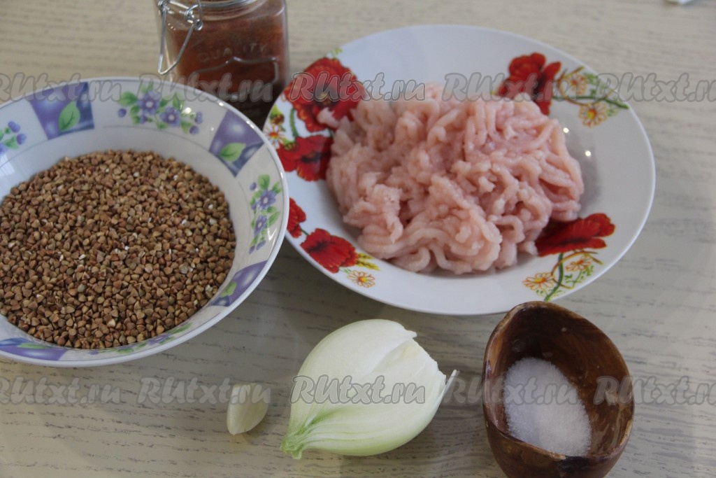 Лук и чеснок тоже перекрутить через мясорубку, добавить к мясному фаршу, сюда же всыпать соль и специи (я использовала копчёную паприку). Гречку промыть и выложить в жаропрочную форму, добавить соль по вкусу.
