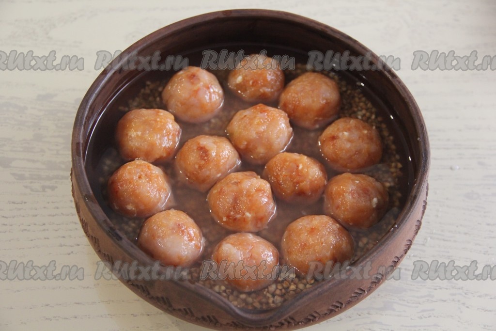 Сформировать из фарша небольшие круглые шарики - фрикадельки и выложить поверх гречки.