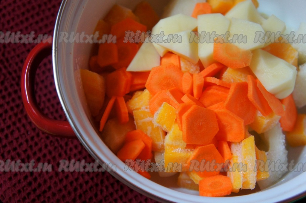 Тыкву и кабачки, нарезанные на кубики, поместить в кастрюлю.