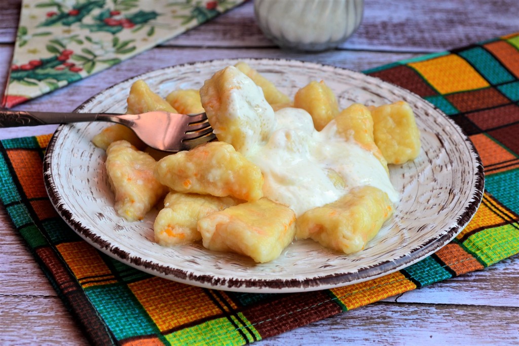 Подавать вкусные и полезные ленивые вареники, приготовленные с тыквой и творогом, можно тёплыми или полностью остывшими со сметаной.