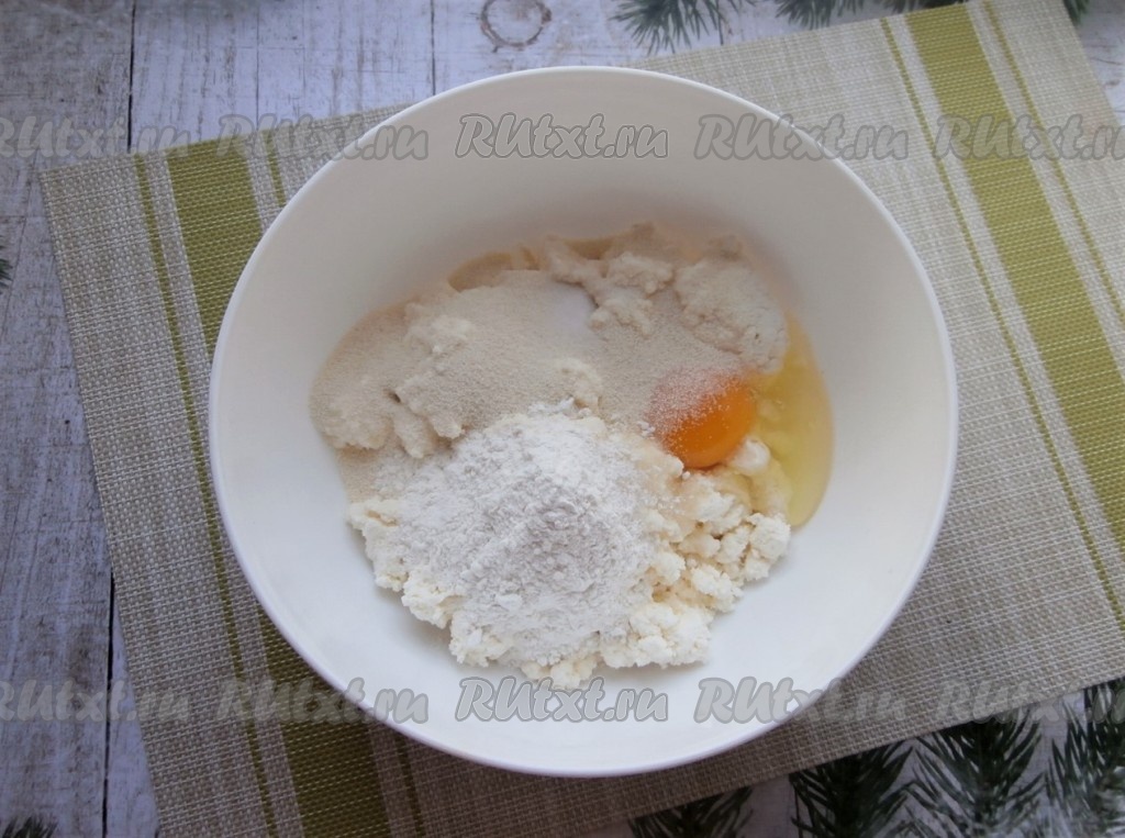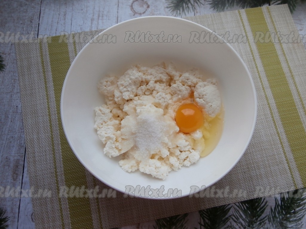 Творог выложить в достаточно объёмную миску, добавить щепотку соли, яйцо, 3 столовые ложки сахара и ванильный сахар.