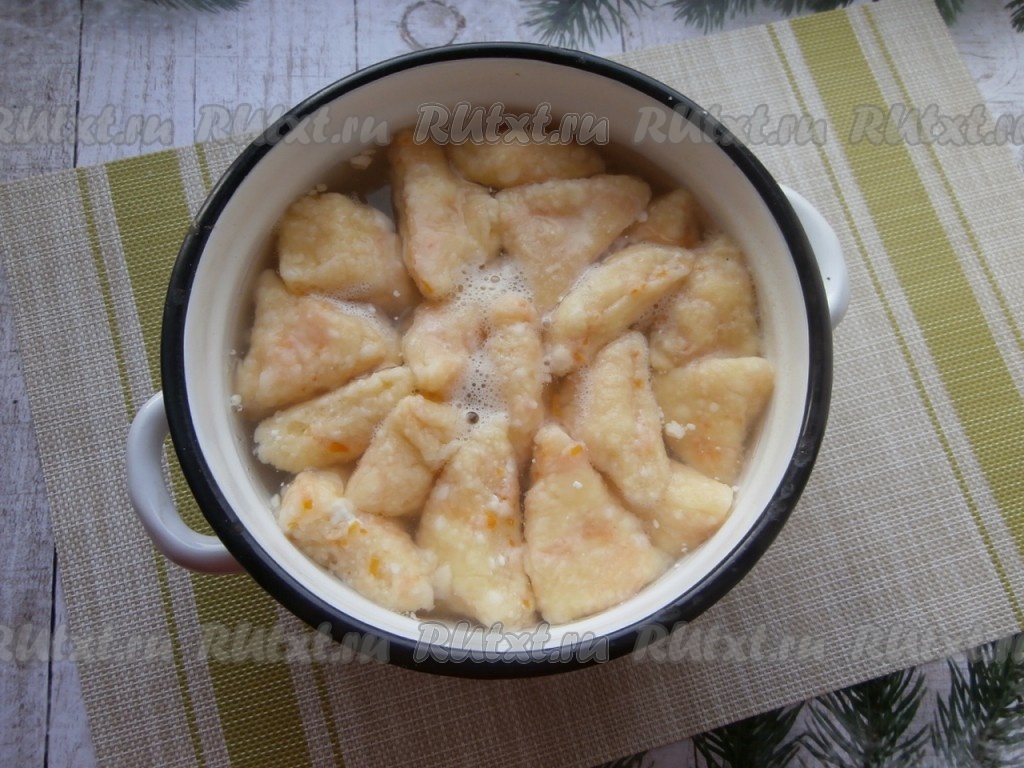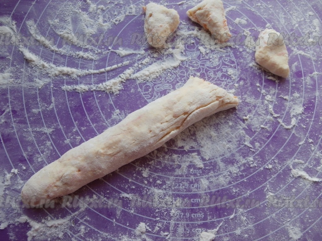 "Колбаски" нарезать на части наискосок, чтобы получились небольшие вареники.