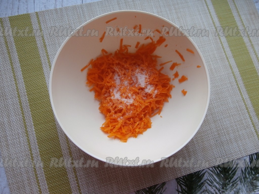 Очищенную тыкву натереть на средней (или мелкой) тёрке, посыпать 1 столовой ложкой сахара, оставить на 10 минут, затем отжать от лишней жидкости.