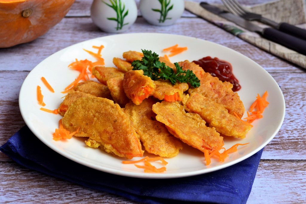 Подавать очень вкусную тыкву, приготовленную в кляре на сковороде, в тёплом виде с любимым соусом или кетчупом, можно есть и без ничего.