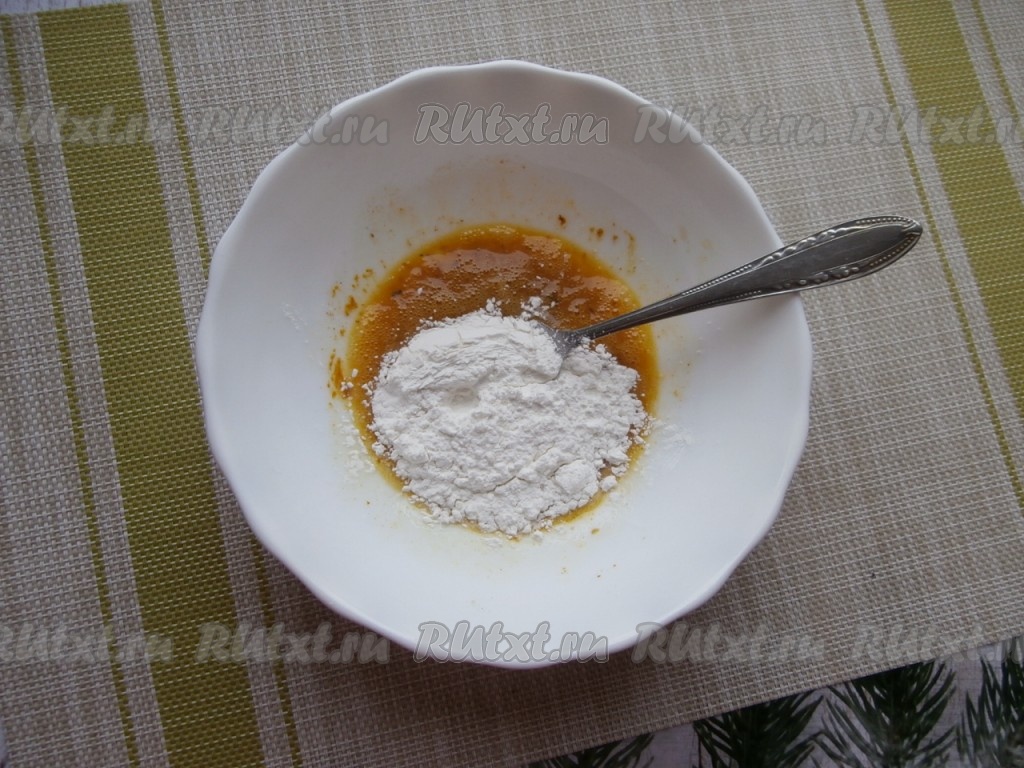 Хорошо разболтать содержимое тарелки вилкой, добавить крахмал, интенсивно перемешать кляр, чтобы не осталось комочков.