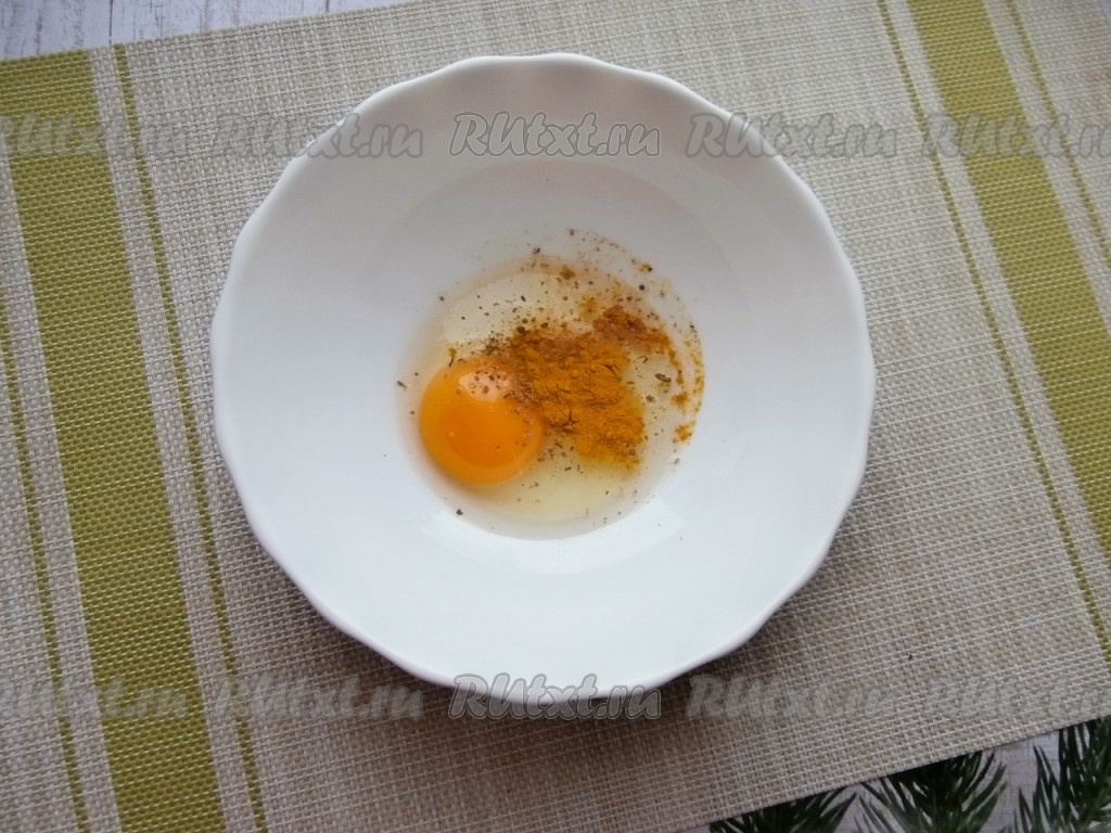 Для приготовления кляра в глубокую тарелку вбить сырое яйцо, добавить соль, куркуму, сушёные травы.
