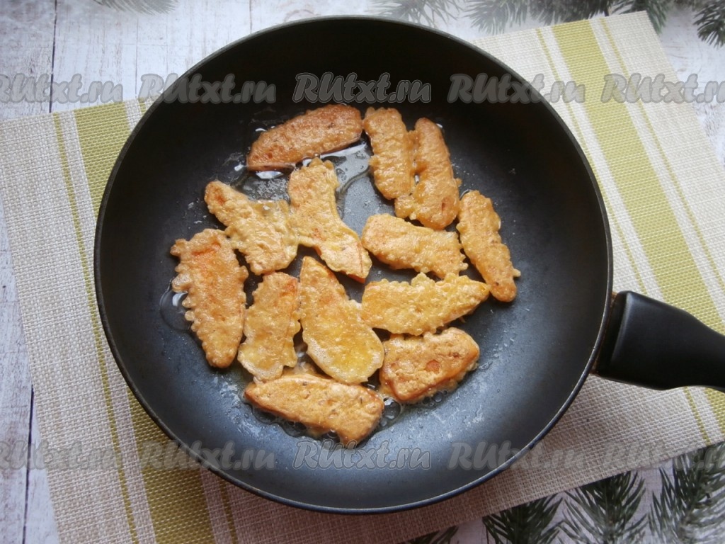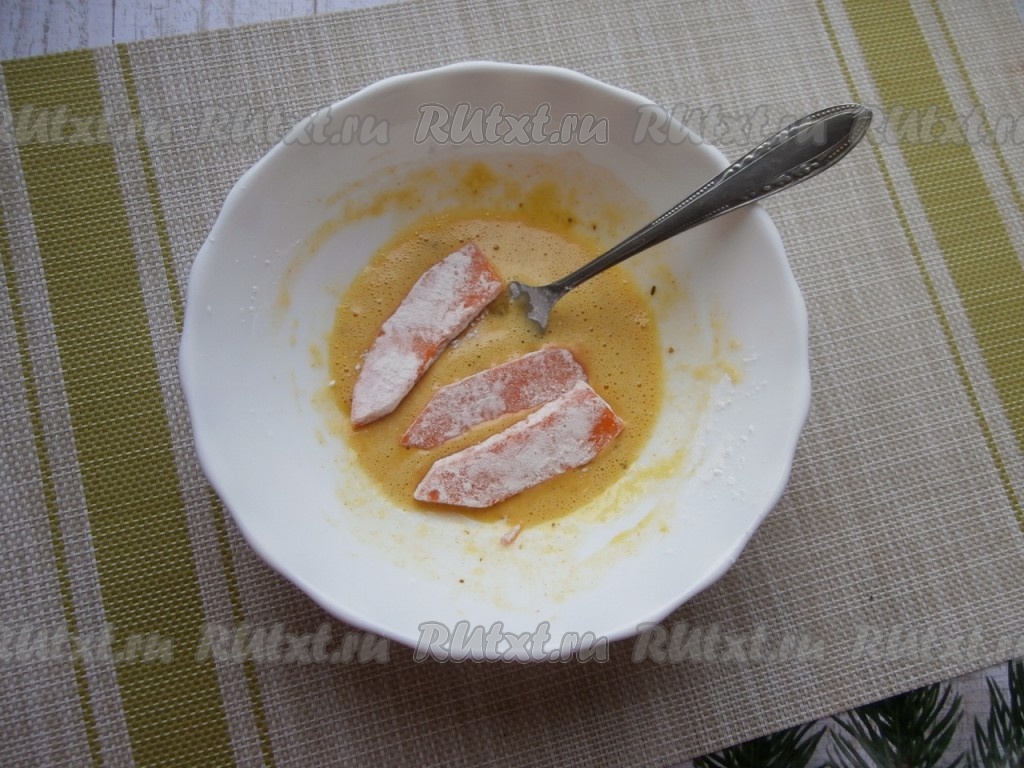 Затем кусочки тыквы, покрытые мукой, окунуть со всех сторон в кляр.