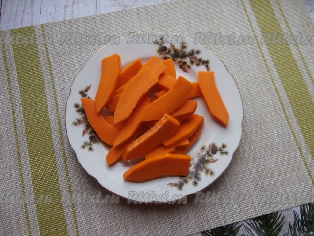Тыкву нарезать на тонкие (толщиной около 0,5-0,7 см) кусочки (или брусочки).