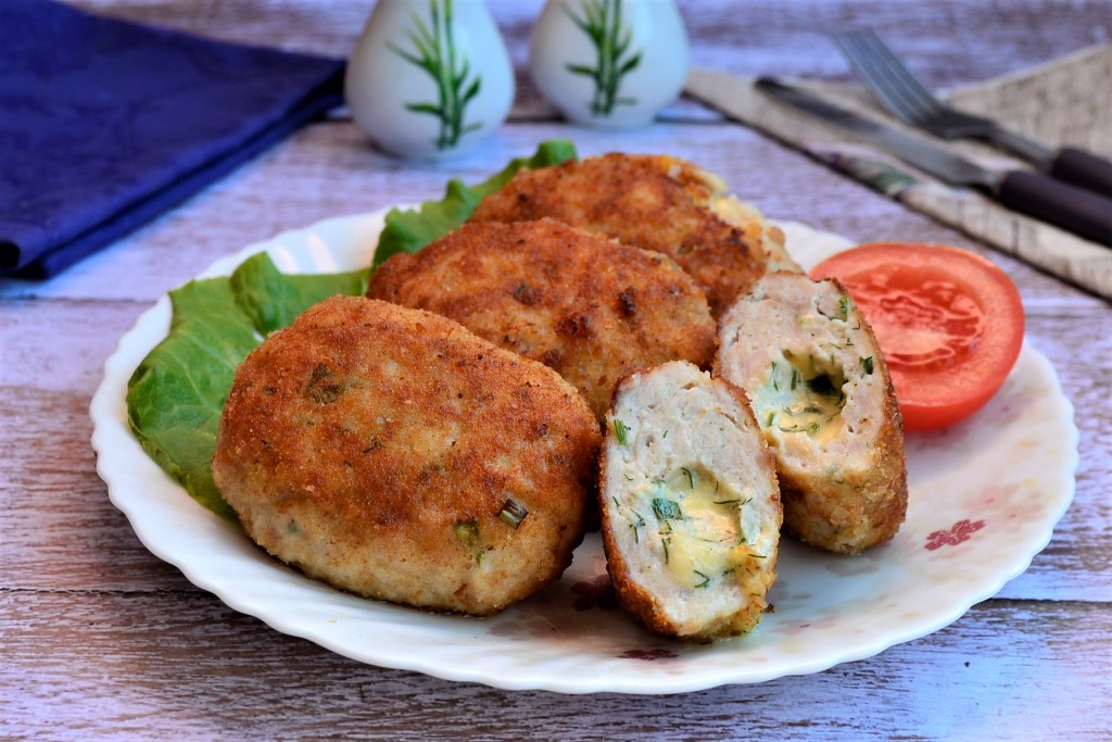 Подавать вкуснейшие, сочные куриные зразы, приготовленные с сыром на сковороде, в горячем виде.