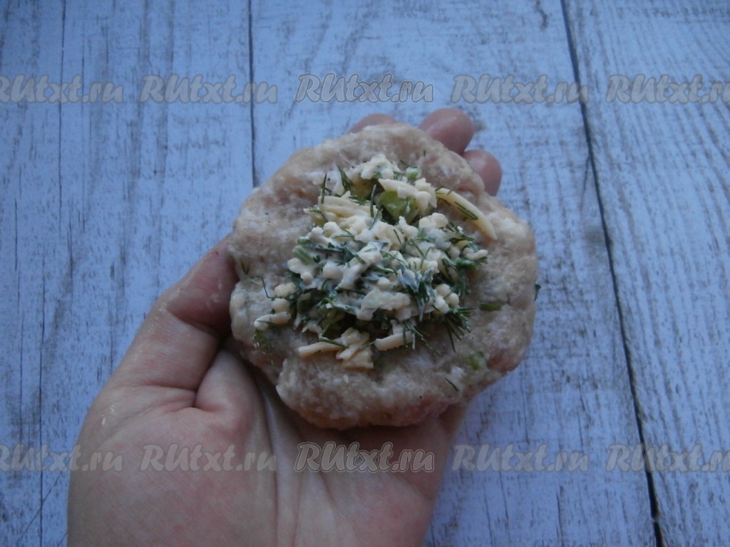 Сделать из фарша круглые лепёшки, внутрь которых поместить по столовой ложке сырной начинки.