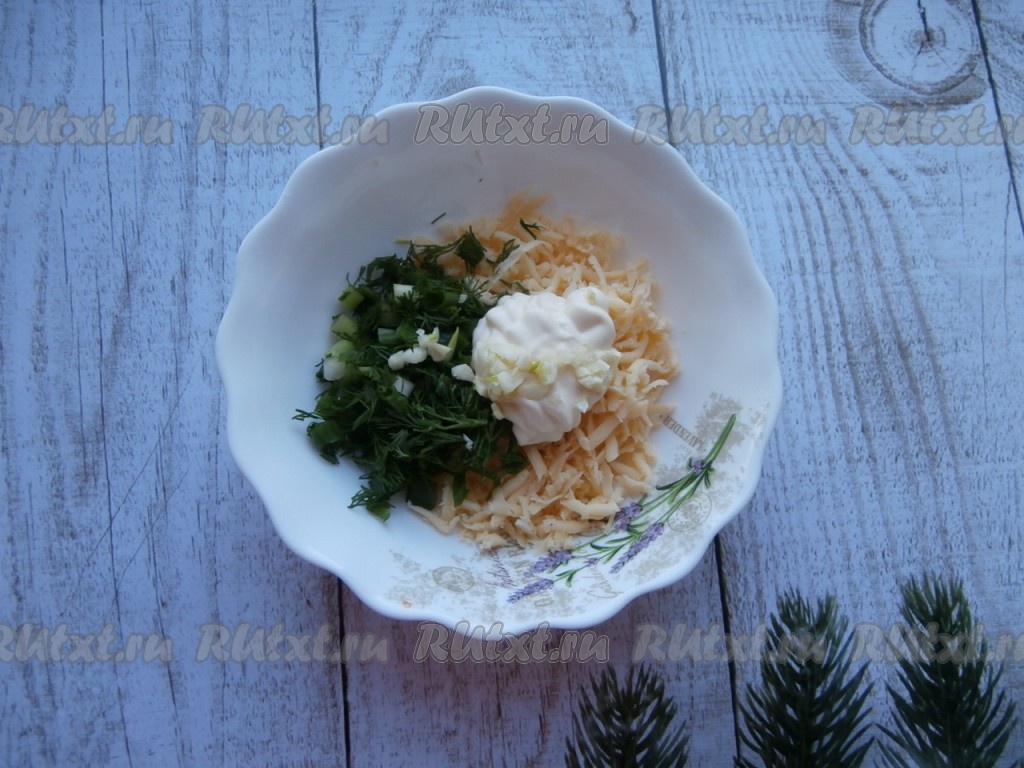 Сыр натереть на средней (или мелкой) тёрке, выложить в другую тарелку, добавить оставшуюся 1 столовую ложку майонеза, вторую половину мелко нарезанного зелёного лука и укропа, а также измельчённый зубчик чеснока.
