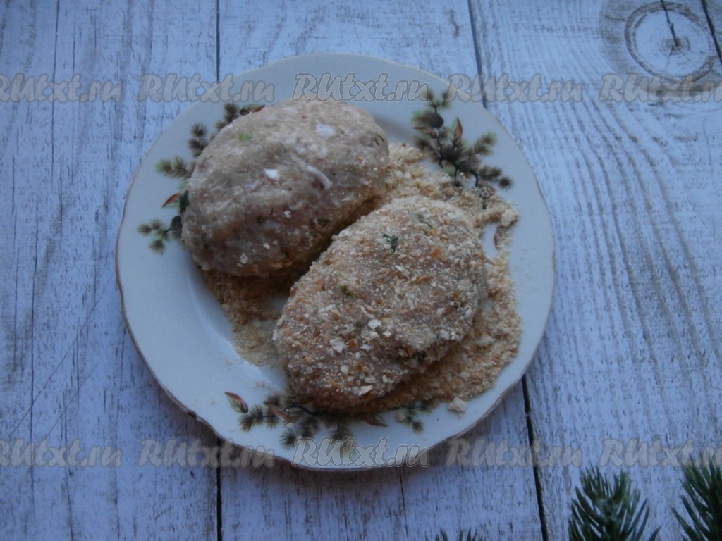 Тщательно слепить края каждой лепёшки, чтобы сыр оказался внутри, формируя продолговатые зразы. Куриные зразы обвалять в сухарях со всех сторон.
