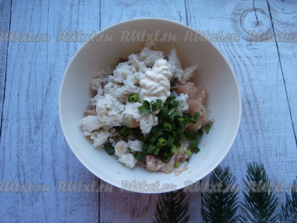 В небольшом количестве молока (или воды) замочить ломтики батона, а затем отжать от лишней жидкости. Куриный фарш, купленный в магазине (или полученный после прокручивания мяса через мясорубку), выложить в глубокую миску, поперчить по вкусу и посолить.