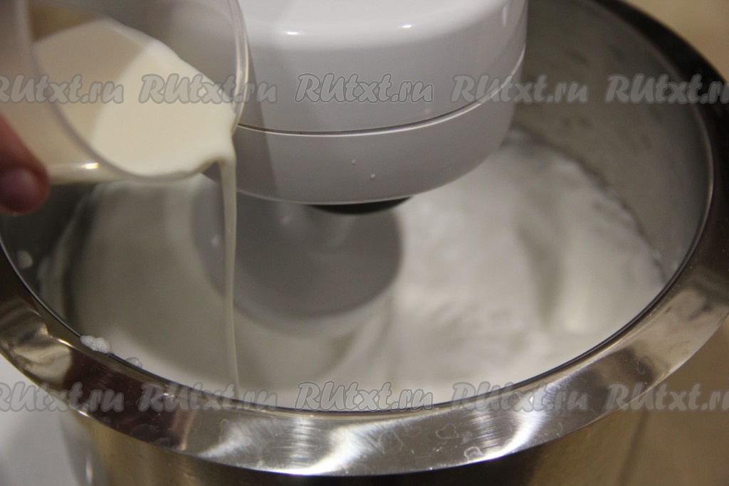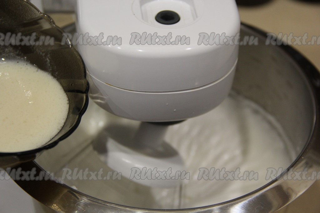Затем, продолжая взбивать, в белки влить тонкой струйкой 50 мл холодного молока.
