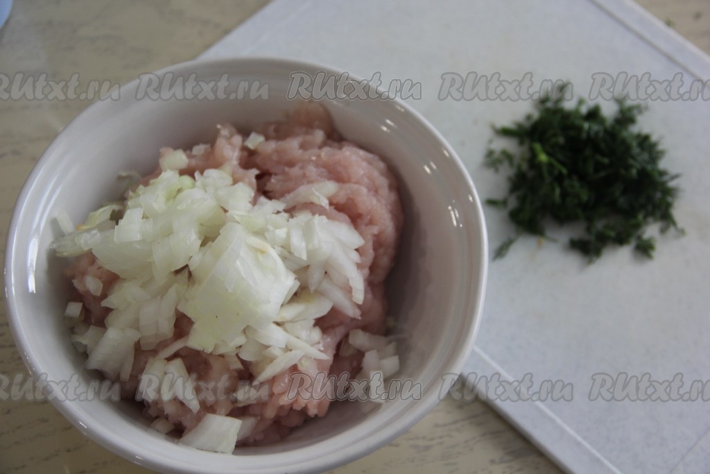 Очищенную луковицу и укроп мелко нарезать и добавить к фаршу, посолить, поперчить, влить 1-2 столовые ложки воды, тщательно перемешать. Добавляя воду, ориентируйтесь на консистенцию фарша, он должен получиться слегка жидковатым.