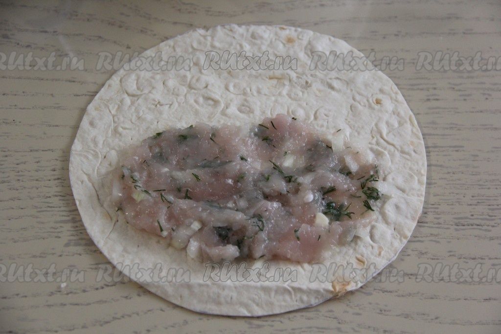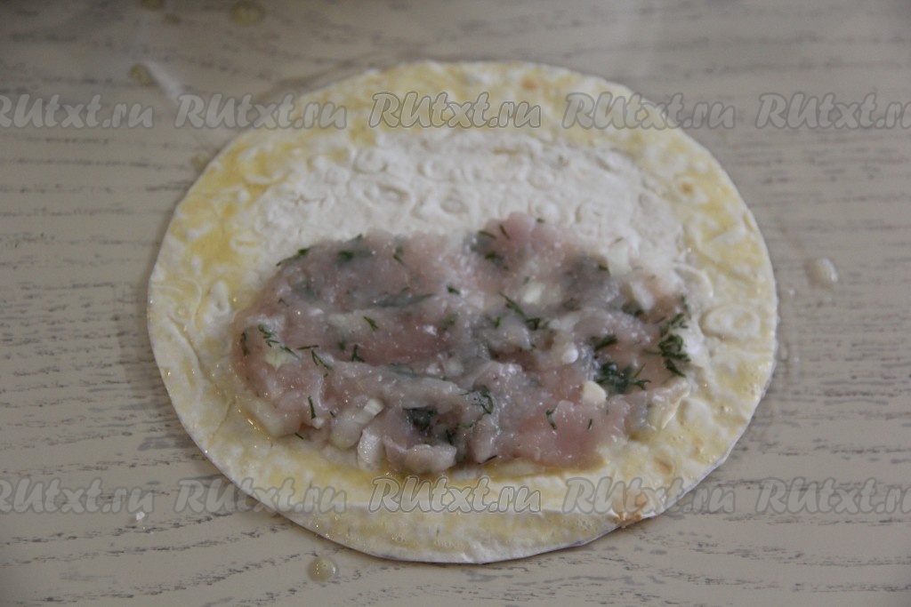 Сложить круг из лаваша пополам, формируя чебурек, скрепить края и крепко прижать. Аналогично сформировать все чебуреки из лаваша с фаршем.