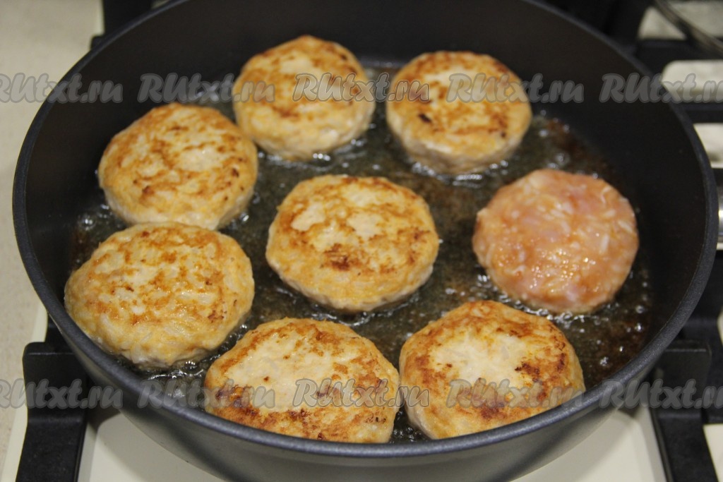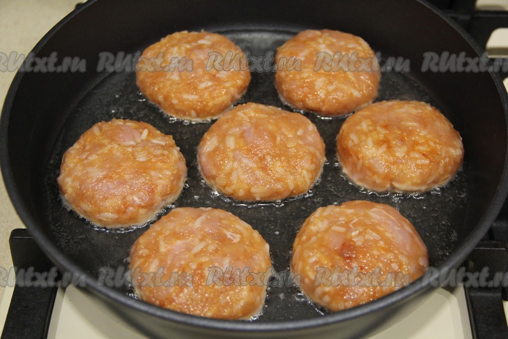 Из получившегося фарша сформировать котлеты. В сковороде прогреть растительное масло и выложить курино-рисовые котлеты.