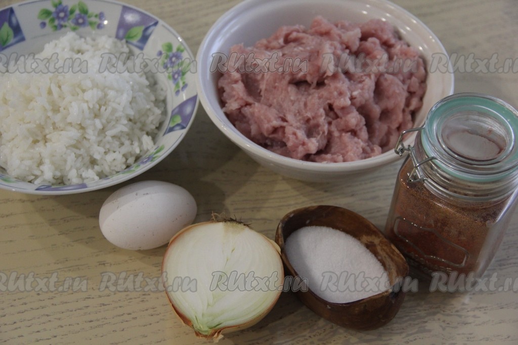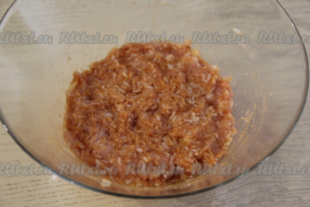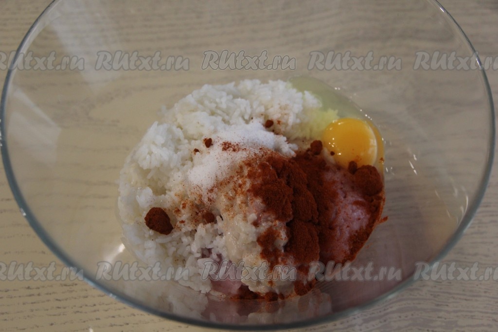 В миску с луком и куриным фаршем добавить рис, яйцо, соль и специи.