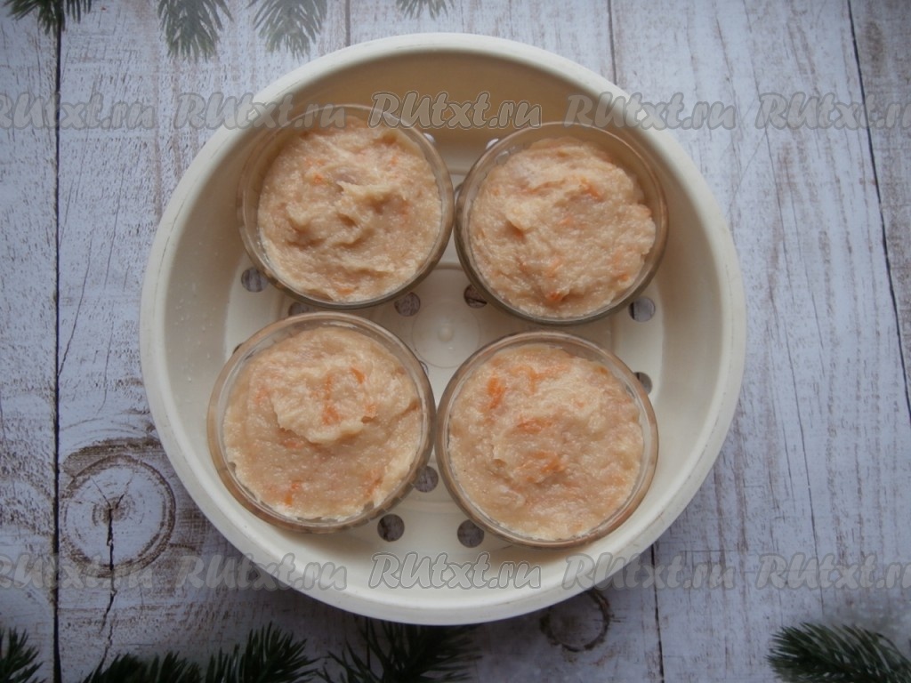Формочки с будущим куриным суфле разместить в специальном поддоне для варки на пару (входит в состав любой мультиварки).