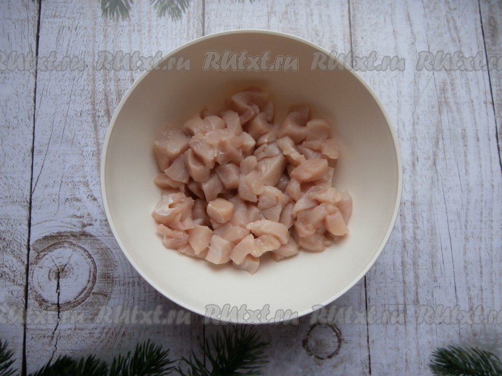 Нарезать куриное филе на небольшие кусочки.
