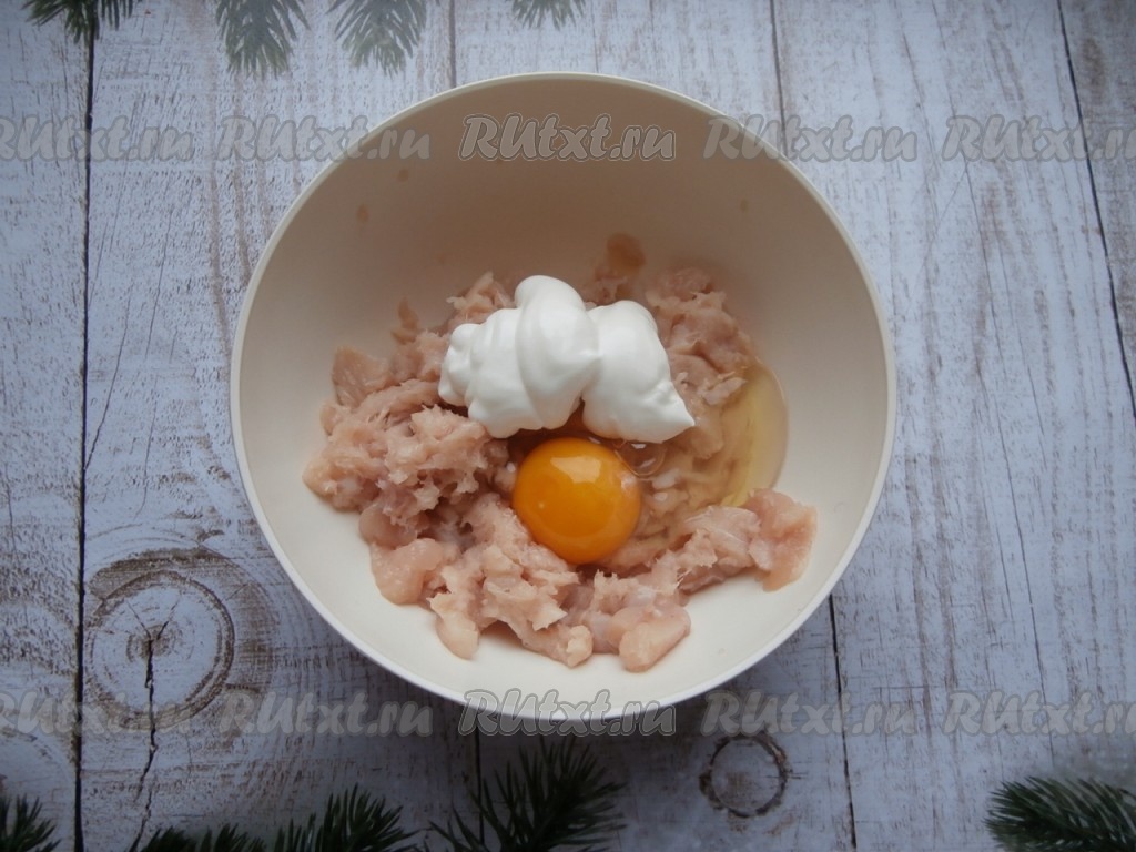 Измельчить филе до состояния фарша погружным блендером, добавить яйцо и сметану.