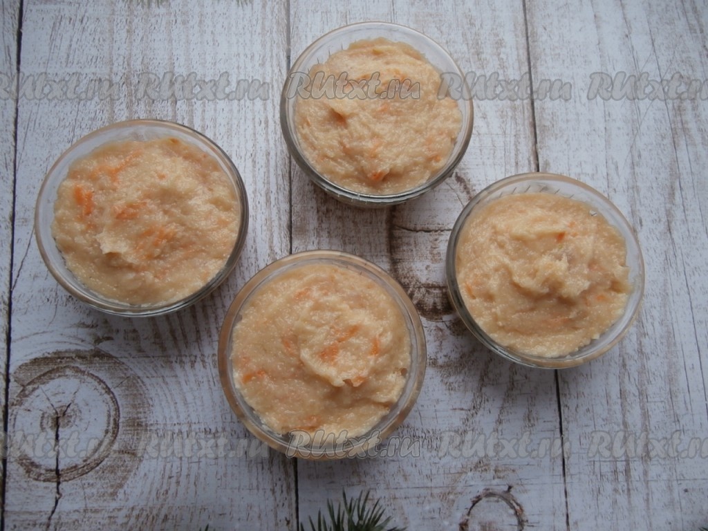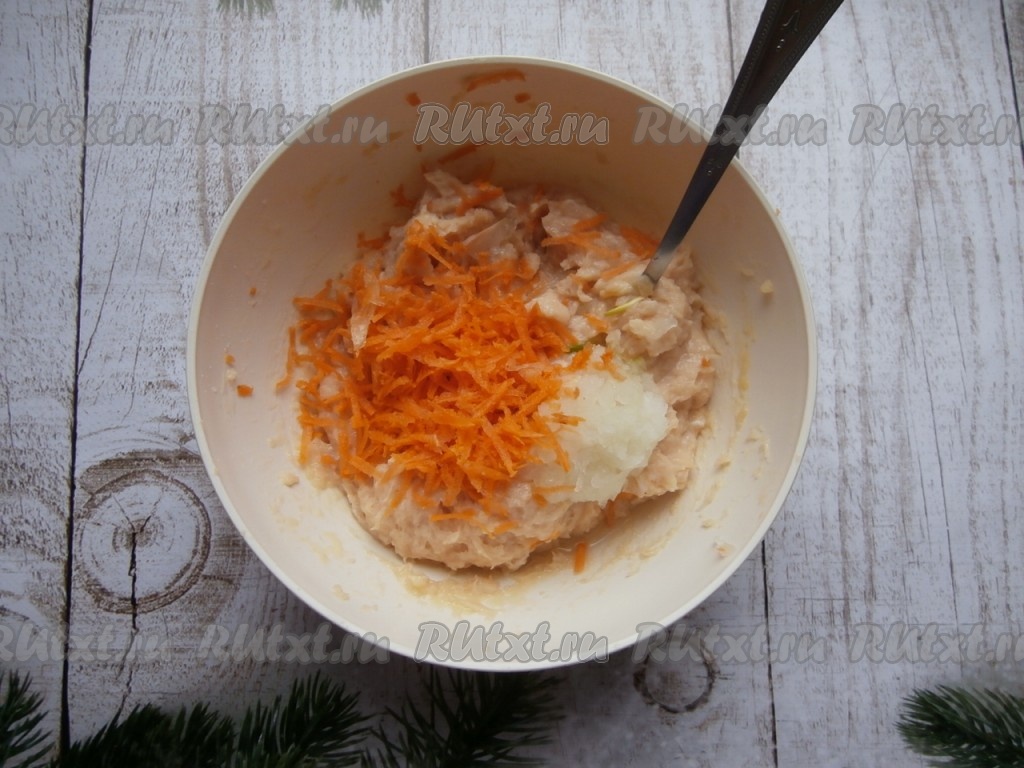 Смешать блендером яйцо и сметану с куриным фаршем, чтобы получилось мясное пюре. Добавить натёртые на мелкой (или средней) тёрке очищенные морковку и лук.