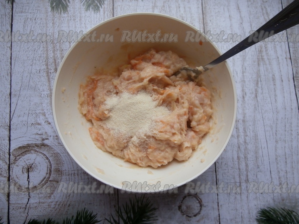 Тщательно перемешать массу ложкой, всыпать манную крупу, посолить по вкусу.
